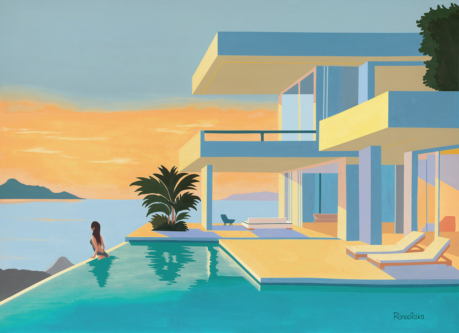 Romina Zabka’s work captures the poetry of stillness. Influenced by the minimalist beauty of coastal architecture and the quiet narratives of everyday spaces, her compositions are precise yet emotionally evocative. Through the careful use of color, light, and geometry, Zabka explores solitude without sadness — moments suspended between movement and pause.