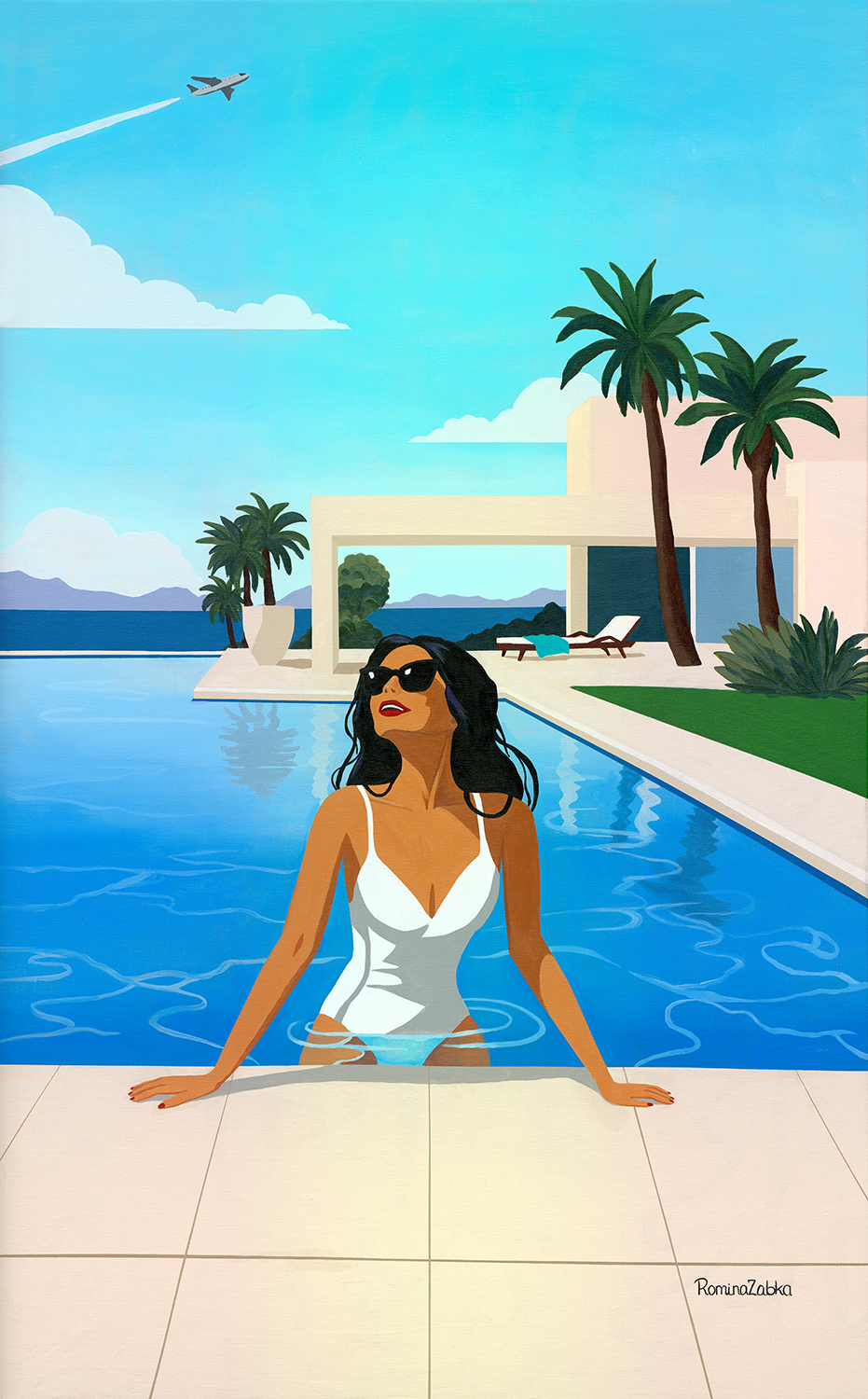 Romina Zabka’s work captures the poetry of stillness. Influenced by the minimalist beauty of coastal architecture and the quiet narratives of everyday spaces, her compositions are precise yet emotionally evocative. Through the careful use of color, light, and geometry, Zabka explores solitude without sadness — moments suspended between movement and pause.